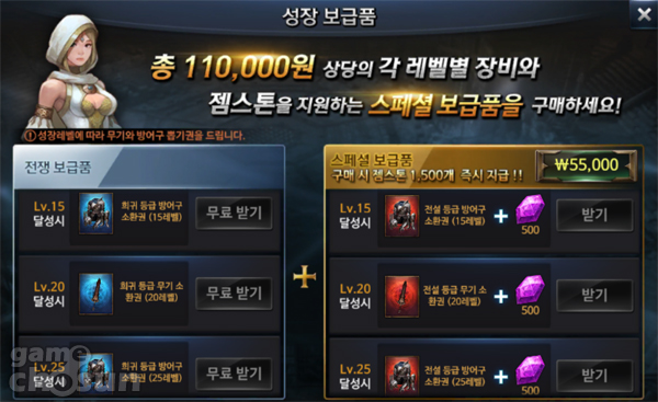 ▲ 레벨별 장비와 젬스톤까지 획득할 수 있어 입문자에게 추천하는 스페셜 보급품 패키지