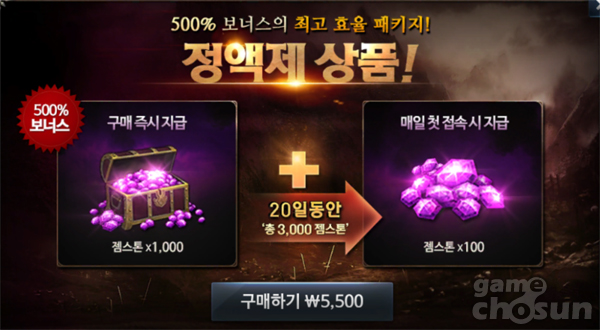 총 3,000 젬스톤 - 구매시 1,000 젬스톤 즉시 지급 - 매일 100 젬스톤 x 20일 |