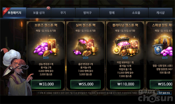 또 빠른 레벨업을 원하는 유저라면 정벌 입장권 960개와 경험치 2배 물약이 주어지는 '레벨업 패키지'가 좋고 이미 많은 시간을 투자해 레벨과 장비에서 앞서나가고 있는 유저라면 마법 재부여권과 용 비늘, 마법의 돌과 명예 점수가 주어지는 '플레티넘 젬스톤 팩'을 추천한다는 의견이 많았다.