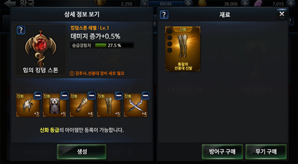 이럴 때 초보자의 경우 장비를 상점에 팔아버리거나 제작 재료로 분해하기 마련인데 '킹덤스톤' 시스템을 이용하면 필요없는 장비를 훨씬 유의미하게 사용할 수 있다.