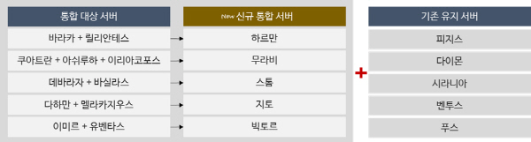 서버 통합은 3월 3일 진행되며, 통합에 앞서 대상 서버는 오는 3월 2일까지 사전 조정 기간을 가진다. 이는 기존 생성된 캐릭터들의 진영이 서로 충돌되거나 동일 진영 캐릭터 수가 10개를 초과할 경우를 방지하기 위함이다.