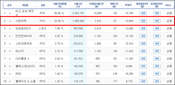 한편 현재 온라인게임 시장은 라이엇게임즈의 '리그오브레전드(이하 롤)'와 서든어택에 점유율 쏠림 현상이 지속되고 있다. 롤과 서든어택의 합산 점유율은 59.2%로 절반이 넘는 수치며 7%대를 유지하고 있는 넥슨의 '피파온라인3'를 제외하면 TOP10에 있는 게임들은 1~2%의 점유율의 기록하고 있는 셈이다.