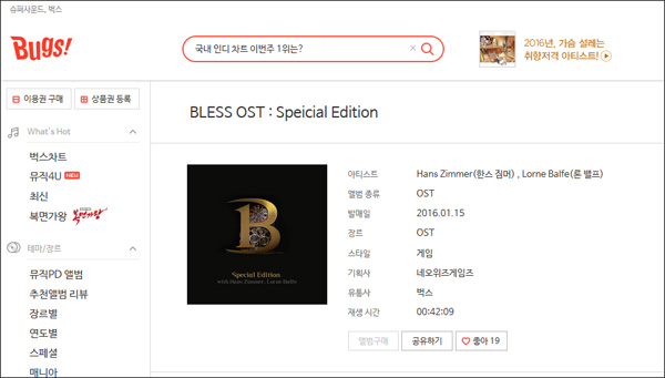 <블레스 OST는 음악전문 사이트 '벅스'에서도 들을 수 있다.>