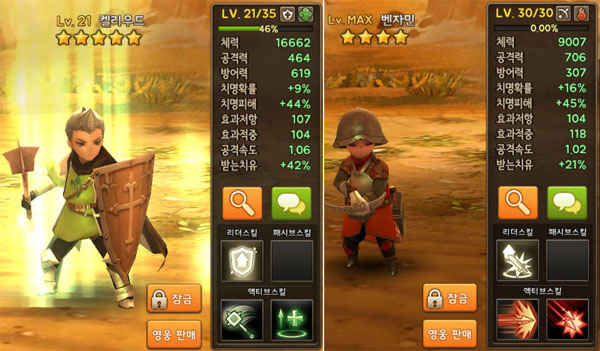 ▲ 방어력, 체력, 받는 치유에 투자한 '켈리우드'와 공격력, 치명타에 집중한 '벤자민'.