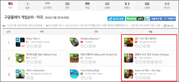 3월 1일 세계 주요 모바일게임 매출 순위 | ||
