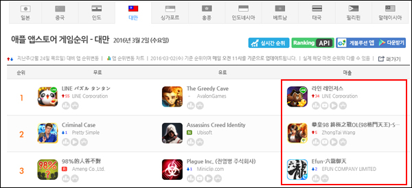 3월 3일 모바일게임 매출에서는 한국과 미국, 일본과 더불어 대만의 매출 TOP3 게임이다.