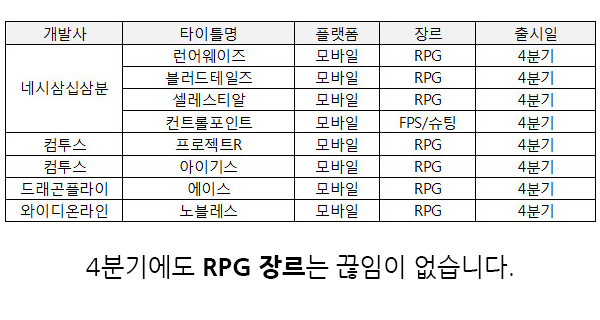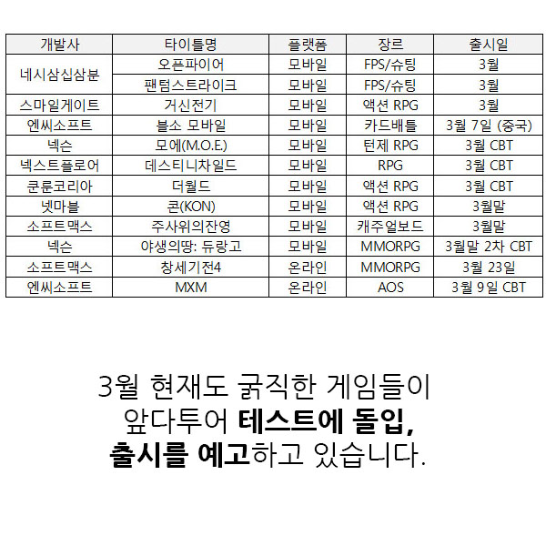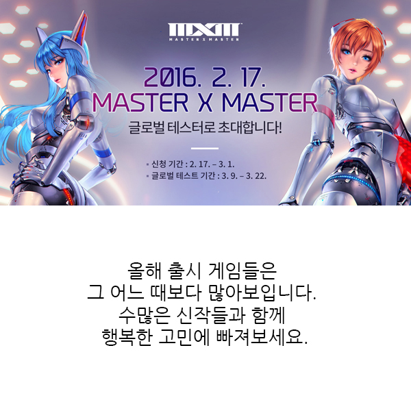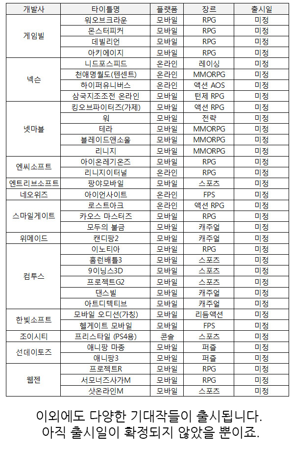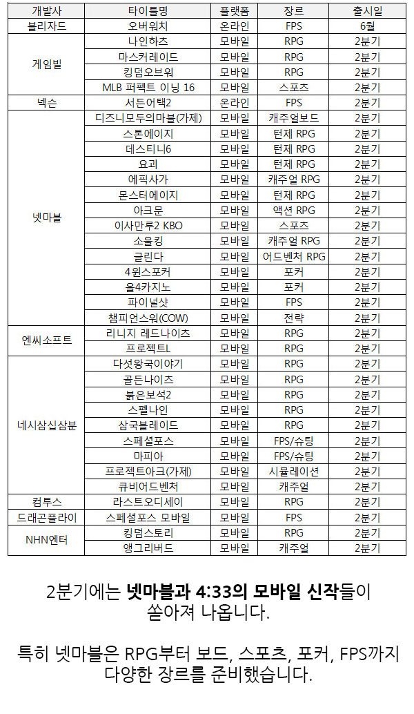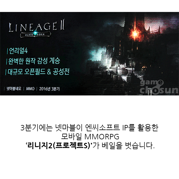 올해도 온라인과 모바일게임에 많은 신작들이 게이머들과 만남을 앞두고 출시 준비 및 최종 담금질에 매진하고 있습니다. 이에 <게임조선>에서는 각 게임사들이 기자간담회 및 실적 발표를 통헤 예고한 2016년 신작 출시 라인업에 관한 카드뉴스를 준비했습니다.