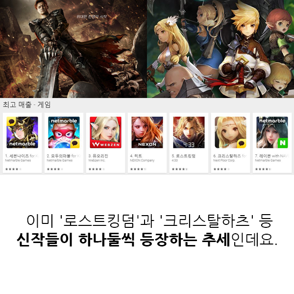 넥슨의 뒤를 이어 구글플레이에 TOP10에 절반 수준의 점유율을 보였던 모바일 강자 넷마블이 1조 729억원으로 업계 두 번째로 1조 클럽에 가입하고 매출 2위를 달성했습니다. 그야말로 시장에서 모바일과 신작이 미치는 영향력이 이전보다 커졌음을 증명하는 사례입니다.