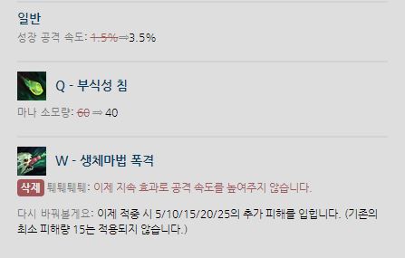 빠른 공격 속도로 강력한 대미지를 자랑했던 코그모의 경우 후반 캐리력이 높아졌다. W스킬 '생체마법폭격'의 공격속도 증가 효과가 삭제됐으나 성장 시 공격 속도는 기존 1.5%에서 3.5%로 상승했다. 따라서 게임이 후반에 돌입하면 여전히 강력한 전투력을 뽐낼 수 있다.