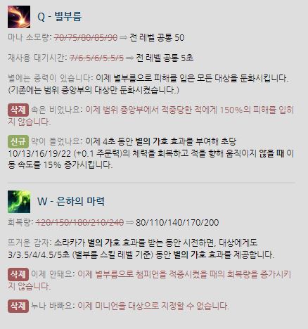 게임 내 가장 큰 치유력을 보유한 소라카는 치유 능력은 감소한 대신 견제 능력이 높아졌다. 회복 스킬인 W '은하의마력'은 회복량이 낮아졌지만 견제 스킬인 Q '별부름'이 모든 대상을 둔화시킨다.