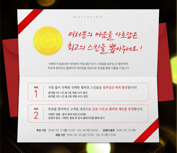 투표가 완료되고 순위가 정해지면 25일부터 31일까지 각 부문별 인기 스킨에 대한 할인 판매가 진행된다. 5개 부문별 1위 스킨 총 5종은 50% 할인된 가격에 판매되며 각 부문별 2위 스킨 5종은 40% 할인된 가격에 구입할 수 있다.