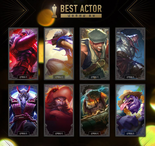이와 함께 '요들연기상'에는 작고 귀여운 이미지의 요들(난쟁이)형 챔피언 스킨 4종이, 특별상에는 비인간형 챔피언 스킨 4종이 후보로 선정됐다. 공로상 부문의 후보는 지난 시즌 e스포츠 리그에서 꾸준한 인기를 끌었던 스킨 4종이다.