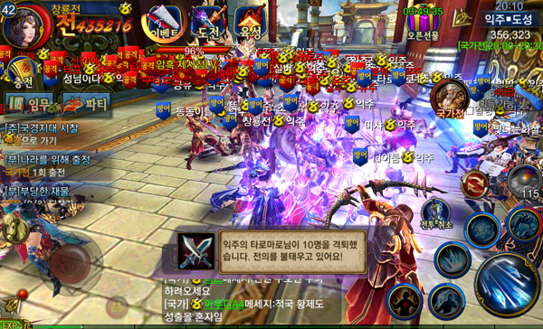 특히 '천명'은 이러한 국가 시스템을 기반으로 한 최대 1000명이 가능한 대규모 PVP(이용자간대결) '국가전'을 핵심 콘텐츠로 내세웠다. '국가전'은 두 국가(지역)씩 매칭돼 전쟁을 치르는 콘텐츠로 매일 20시부터 20시 30분까지 펼쳐진다.각 국가는 공격과 수비 국가로 나뉘어 각 진영의 대장과 수호신을 격퇴하거나 방어하면 승리한다.