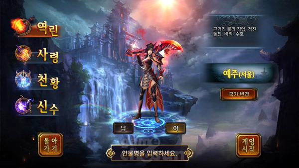 게임에는 역린과 천왕, 사령, 신수 4종의 캐릭터가 등장한다. 이용자들은 각 캐릭터의 성별을 선택해 취향대로 게임을 즐길 수 있다. 역린은 근거리 물리 및 방어가 뛰어난 캐릭터로 검을 활용한 돌진이 특징이다. 또한 사령은 창을 활용한 치명타 공격이 특징인 캐릭터로 추격에 용이하다. 천왕은 원거리 마법사로 후방에서 광역 마법 기술을 사용하며 신수는 활을 사용하는 원거리 궁수로 높은 지속 대미지를 자랑한다.