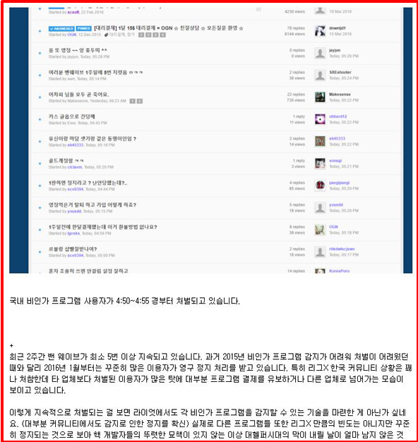 ▲ 지난 23일 리그오브레전드 국내 한 커뮤니티 이용자는 헬퍼 사용자가 정지되고 있는 것을 체감한다고 밝혔다.