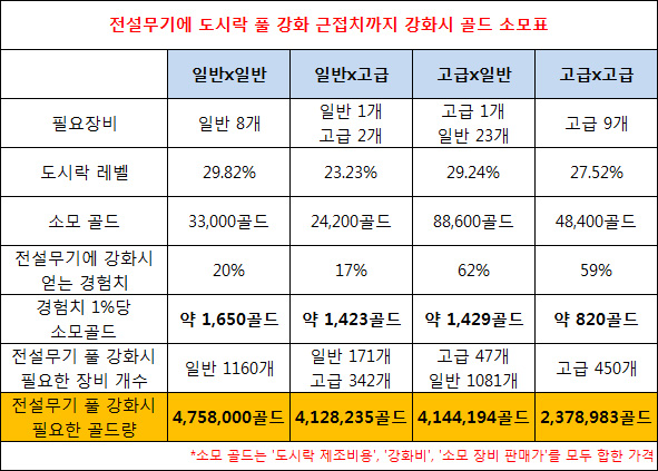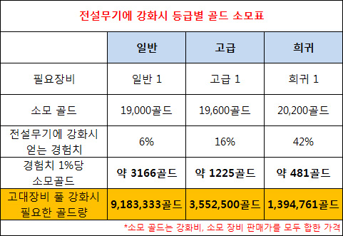 표를 보면 등급이 높은 장비를 재료로 쓸 수록 소모비가 획기적으로 줄어드는 것을 알 수 있다. 이렇듯 일반과 고급 장비를 하나씩 재료로 사용하는 경우는 엄청난 골드 소모로 이어진다. 솔직히 어지간한 과금을 한 게이머들도 아주 급한 경우가 아니면 이런식의 강화를 하지 않는다.