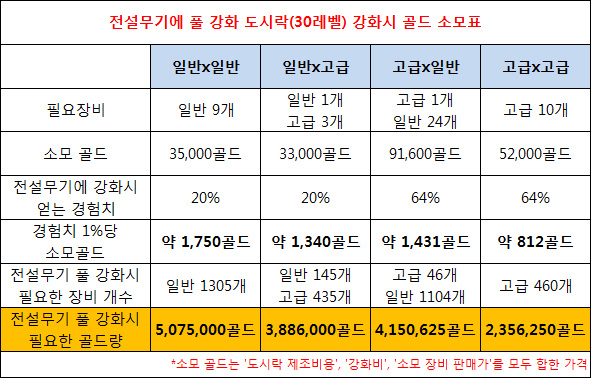 아래는 전설 무기에 일반 등급, 고급 등급, 희귀 등급을 재료로 사용했을 때 얻는 경험치와 1% 올리는데 필요한 골드를 정리한 것이다.