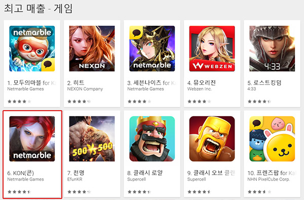 지난 3월 30일 넷마블게임즈(대표 권영식)가 출시한 신작게임 '콘'이 구글플레이 게임 부문 최고매출 순위에서 6위에 올랐다.