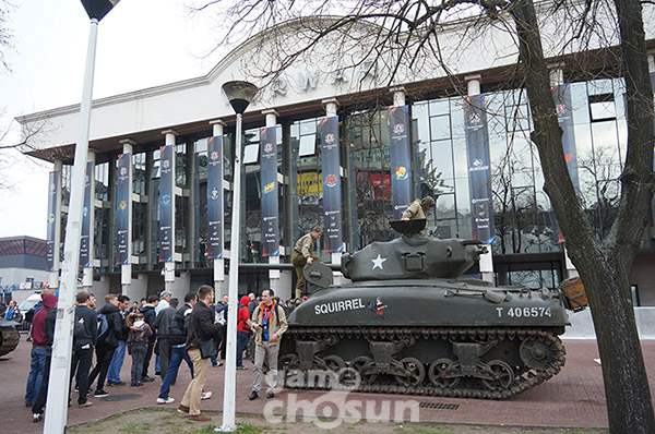 ▲ 대회가 열리는 폴란드 바르샤바 토르바르 홀 경기장 앞에는 실제 탱크가 전시됐다.