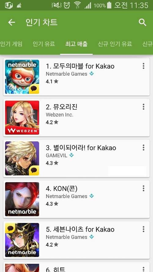 ▲ 2016년 4월 13일 구글플레이 매출순위