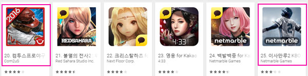 14일 구글플레이 게임 부문 최고매출순위에 따르면 ‘컴투스 프로야구2016’과 넷마블의 ‘이사만루2 KBO’가 각각 20위와 25위를 차지하며 상승세를 타고 있다.