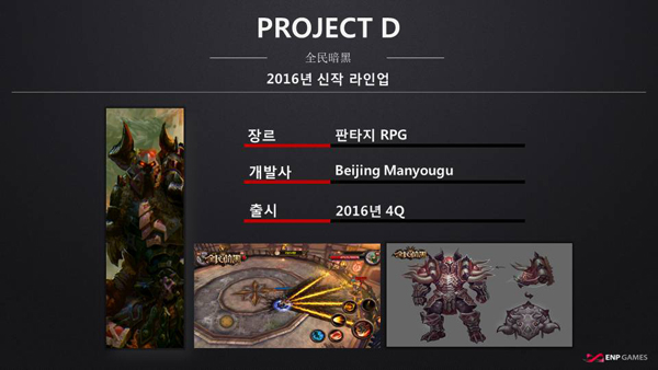 프로젝트D는 베이징 만요우구가 개발하는 액션 RPG다. 방 실장은 이 게임을 지난해 출시작인 '크로우'를 이어갈 정통 액션 RPG로 꼽았다. 화려한 액션과 타격감, 스킬이 주 특징이며 기존 액션 RPG 요소인 실시간 대전 등을 갖출 예정이다.