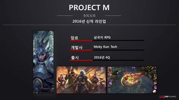 프로젝트M은 중국의 모키쿤 테크가 개발하는 RPG게임. 70여종의 삼국지 캐릭터가 새로운 판타지 캐릭터로 등장한다. 이 게임은 PVP가 특징인데 1대 1부터 6대 6까지 구현할 예정이며 AOS 모드도 추가할 계획이다.