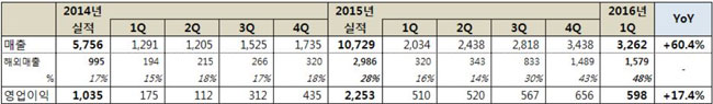 매출은 3262억원으로 전년 동기 보다 60.4% 증가했다. 특히 해외매출은 전체 매출 대비 48% 수준인 1579억원으로 사상 최대치를 달성했다.