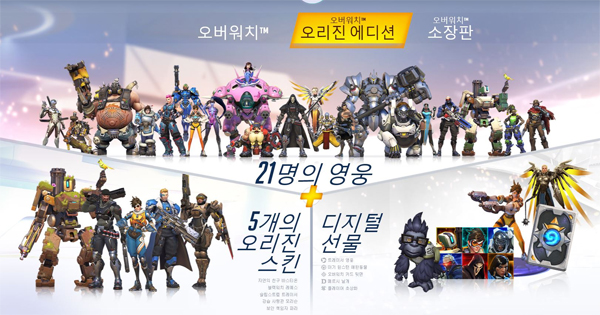 먼저 오리진 에디션 패키지는 디지털 버전 오리진 에디션과 동일한 구성과 가격(6만9000원)으로 판매된다. 패키지에는 21명의 영웅과 상징적 배경, 오리진 스킨 5종(자연의 친구 바스티온, 블랙워치 레예스, 슬립스트림 트레이서, 강습 사령관 모리슨, 보안 책임자 파라)이 포함되며 월드오브워크래프트 '아기윈스턴' 애완동물과 히어로즈오브더스톰의 '트레이서' 영웅, 하스스톤 카드 뒷면, 디아블로 메르시 날개, 스타크래프트 플레이어 초상화가 특전으로 포함된다.