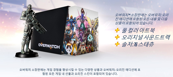 또 소장판은 온라인 5000장 한정 수량으로 판매되며(14만9000원) 오리진 에디션에 포함된 모든 내용과 일러스트 아트북, 오리지널 사운드트랙, 솔저76 스태츄가 특전으로 추가돼 소장가치를 높였다. 더불어 예약 구매 선착순 2000명에게는 오버워치 마우스 장패드가 주어지며 예약자 전원에게 위도우메이커 '누아르 스킨'이 제공될 예정이다.