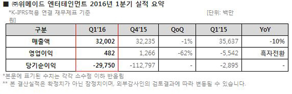위메이드엔터테인먼트(대표 장현국)가 2016년 1분기 영업이익이 연결기준 4억8200만원을 기록해 전년동기 대비 흑자전환했다고 11일 발표했다.