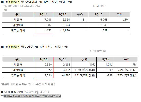 조이맥스(대표 이길형)는 2016년 1분기 매출이 전년동기 대비 15% 증가한 79억8800만원을 기록했다고 11일 발표했다. 영업손실은 8억 8200만원, 당기순이익은 4억 5200만원으로 적자를 지속했다.