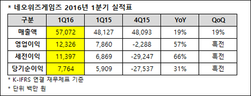 네오위즈게임즈(대표 이기원)가 13일 국제회계기준(K-IFRS) 연결 재무제표 기준으로 한 2016년 1분기 실적을 발표했다.