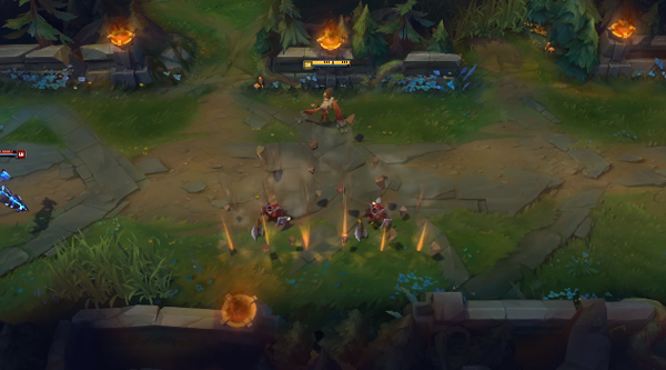 Q스킬은 ‘파편 난사’다. 해당 스킬를 사용하면 탈리야가 주변의 땅을 부숴 다섯개의 바위 조각을 목표 방향으로 날린다. 여기에서 부서진 땅은 몇 분 간 ‘다져진 땅’이 되는데 이 위에서는 탈리야의 이동 속도가 소폭 증가한다.