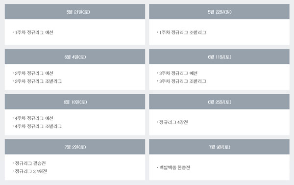 이번 리그는 특별 초청전을 시작으로 약 3개월 간의 일정에 돌입했다. 정규 리그는 7월 22일까지 상위 4개 클랜과 선발된 12개 팀 등 총 16개팀이 4개 조로 나눠 조별 토너먼트를 치른 뒤 조별 1위 팀이 최종 토너먼트를 통해 우승팀을 가리는 방식으로 진행된다.
