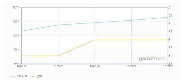 오버워치의 PC방 점유율은 24일 11.70%에서 출발해 25일 13.89%, 26일 14.70%, 27일 15.53% 28일 16.61%를 기록 중이다.