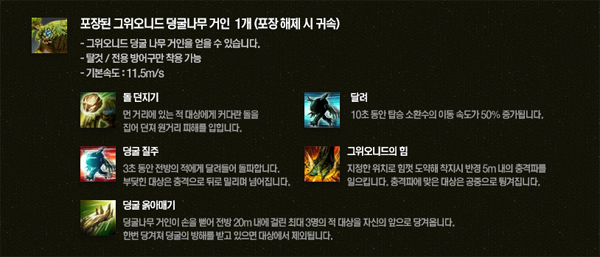 거인은 원거리에 피해를 입히는 ‘돌 던지기’와 10초간 이속이 50% 증가하는 ‘달려’, 3초동안 전방으로 돌진해 상대를 쓰러뜨리는 ‘덩굴 질주’, 착지 시 충격파를 일으켜 적을 공중으로 띄우는 ‘그위오니드의 힘’, 전방 20미터 내에 걸린 적 3명을 앞으로 당겨오는 ‘덩굴 옭아매기’ 총 5가지의 강력한 스킬을 보유하고 있다.