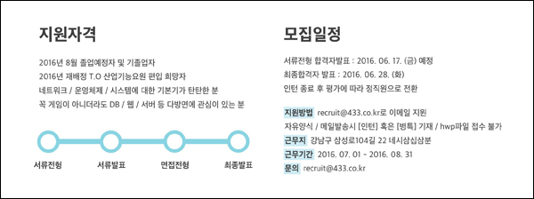 인턴 근무 기간은 7월 1일부터 8월 31일까지 약 8주간이며 인턴 종료 후 평가에 따라 정직원으로 채용될 수 있다. 서류 전형은 오는 15일까지 약 2주간 진행되고 28일 최종 합격자를 발표할 예정이다. 지원 희망자는 본인의 이력서와 자기소개서를 채용 담당자(recruit@433.co.kr)에게 보내면 된다.