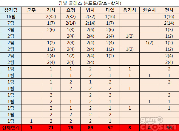 본선에 진출한 팀 중 가장 많은 클래스는 '마법사'로 360명 중 89명이 등록돼 있다. 한 팀에 동일 클래스는 2명까지만 등록할 수 있다는 점을 감안하면 단 1팀만 빼고 모든 팀에서 2명씩 출전한 셈이다. 다음으로는 '요정' 79명, '기사' 71명 순으로 높은 참가율을 기록했다.