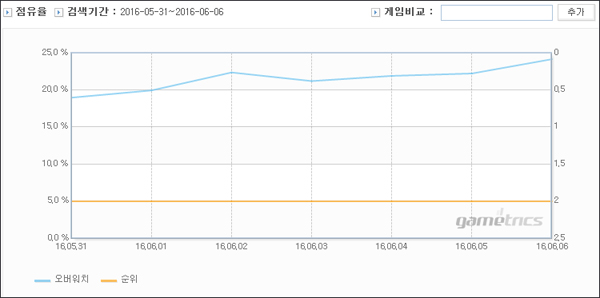 게임은 5월 24일 출시 직후부터 점유율 11.70%로 흥행 가도를 달리기 시작해 1일 20.01%로 마의 20%대를 돌파했으며 2일에는 22.45%까지 점유율이 오르며 1위와의 격차를 8.32%로 좁혔다.