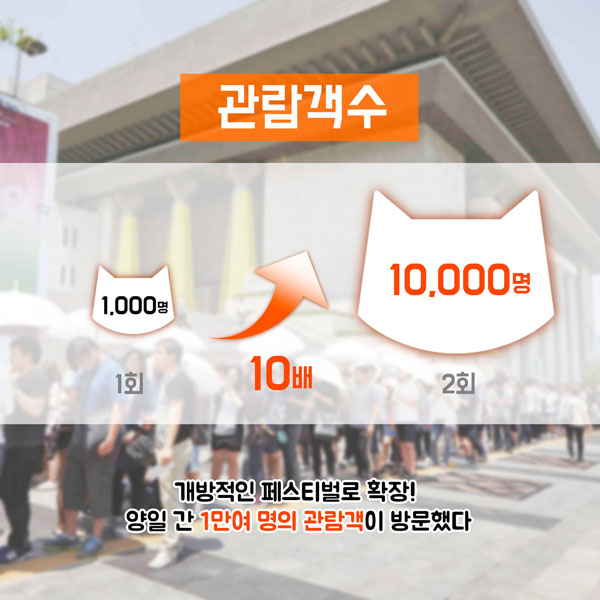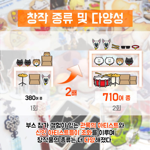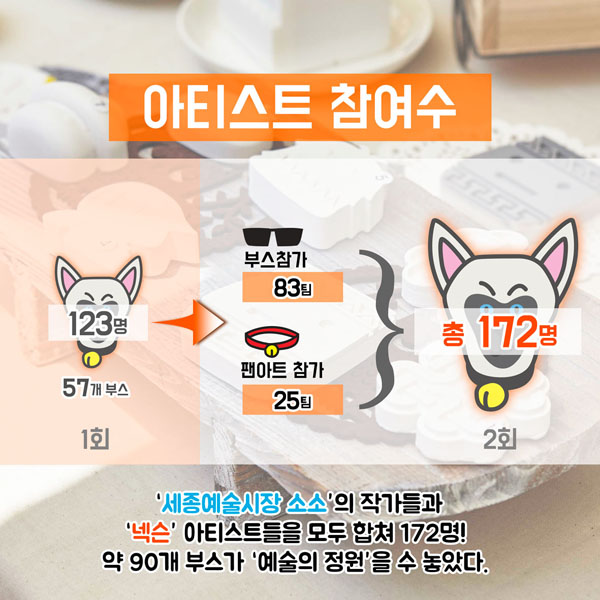 먼저 관람객은 1회 1000명에서 2회 1만 명으로 10배 성장하며 개방적인 페스티벌로 확장됐다. 아티스트 참여수도 1회 때 123명에서 172명으로 약 90개 부스가 예술의 정원에 자리 잡고 관람객들과 함께했다.