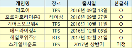 엑스박스 진영의 맏형 ‘헤일로’의 RTS(실시간전략시뮬레이션) 버전인 ‘헤일로워즈2’는 처음으로 인게임 영상과 출시일(2017년 2월 21일)을 공개해 주목 받았으며 대표 TPS(3인칭슈팅)게임 ‘기어스오브워4’도 10월 11일 출시를 앞두고 새로운 게임플레이 영상을 공개했다.