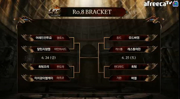 20일 엔씨소프트에 따르면 '어레인전투요', '얄밉지혈맹', '훅팀프리' '미치광이엘케이', '쥬드빠염', 캐스톨어린', '훅팀', 빠염' 등이 오는 24일과 25일 양일간 열리는 LFC 본선 토너먼트 8강전에서 맞붙는다.
