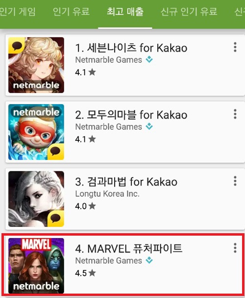 한편 넷마블은 구글플레이 게임부문 최고 매출순위 5위 안에 '세븐나이츠 for kakao(1위)', '모두의마블 for kakao(2위)', '마블퓨처파이트(4위)' 총 3종을 보유하게 됐다.