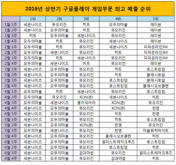 ▲ 2016년 상반기 구글플레이 매출 탑5 (매주 일요일 기준)