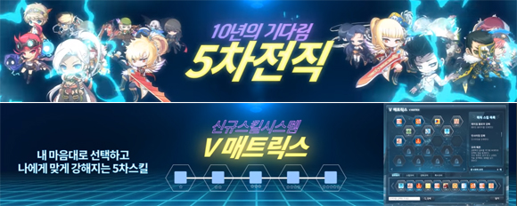이 게임은 오는 14일 적용될 '메이플스토리V'를 통해 10년만에 선보이는 5차 전직과 신규 대륙 '아케인 리버', 200레벨 장비 등을 선보인다.