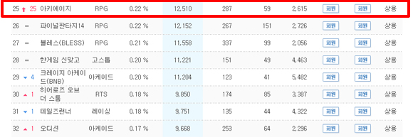 14일 게임트릭스에 따르면 엑스엘게임즈(대표 송재경)의 '아키에이지'는 PC방 점유율 0.22%로 25위(13일 기준)를 차지했다. 이는 무려 25계단 올라간 수치다. 업데이트 당일부터 크게 상승했기에 관심을 모은다.