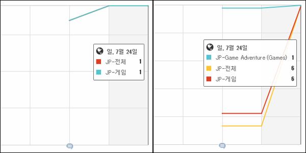▲ 포켓몬고 일본 출시 후 매출 순위 변화 그래프 (좌:애플앱스토어, 우:구글플레이)