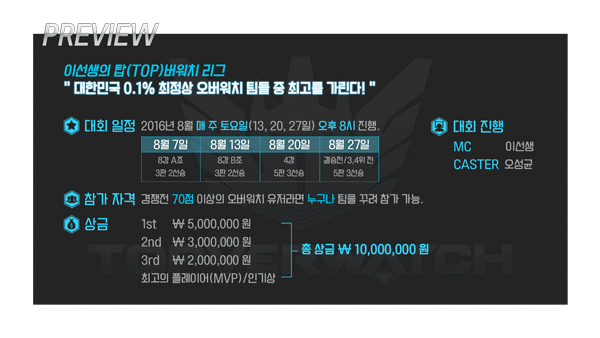 '대한민국 0.1% 오버워치 최고 플레이어를 가린다'는 슬로건으로 진행되는 이번 대회는 경쟁전 점수 70점 이상의 고랭크 유저만 참가할 수 있으며 대회는 매주 토요일 오후 8시 8강 토너먼트로 진행된다.