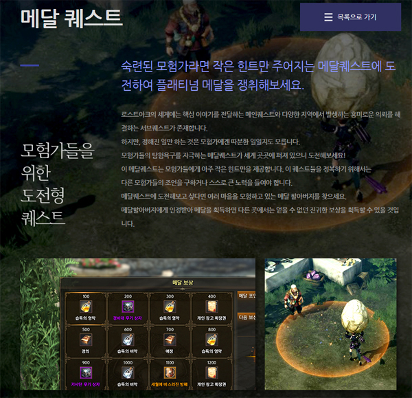 더불어 메인퀘스트 외 다양한 지역에서 발생하는 ‘메달퀘스트’는 일종의 서브 퀘스트 개념으로 단순히 몬스터를 잡거나 특정 물품을 수집하는 것이 아닌 제공되는 힌트를 통해 각종 사건을 푸는 추리 형식의 콘텐트로 예상된다.